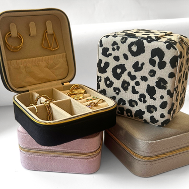 This compact jewellery box features plain colour velour fabric upholstery. Fully lined, it opens and closes with a zip and is perfect for storing and organising small jewellery items at home or on the go. The interior features tabs to secure chains, slots for rings, and compartments for earrings.